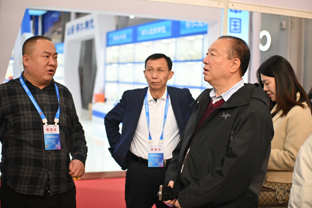 中国陶瓷工业协会常务副理事长吴越申(左一)理事长刘挺(左二)秘书长樊瑞新(右一)参观展区