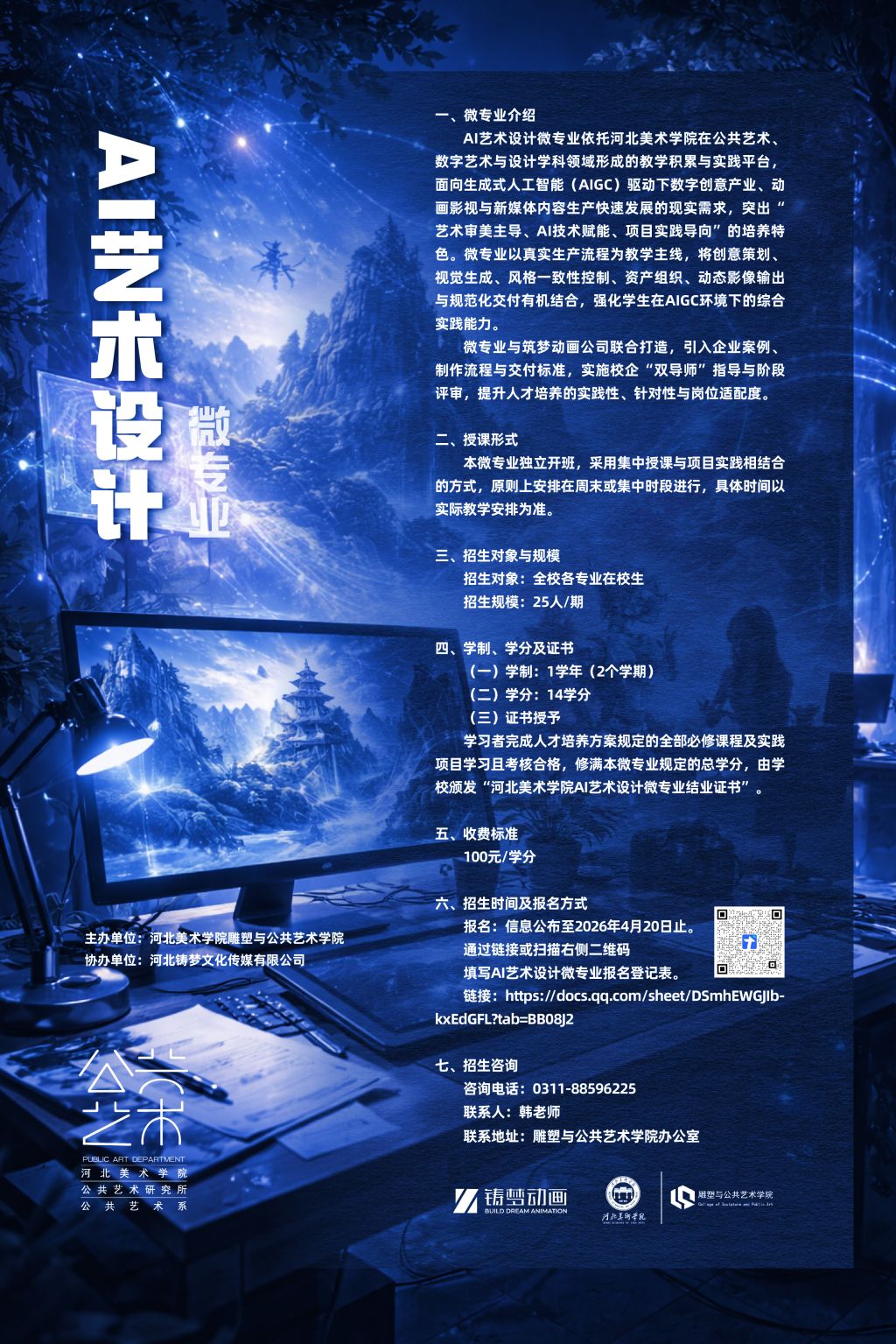 通过链接或扫描右侧二维码填写AI艺术设计微专业报名登记表。